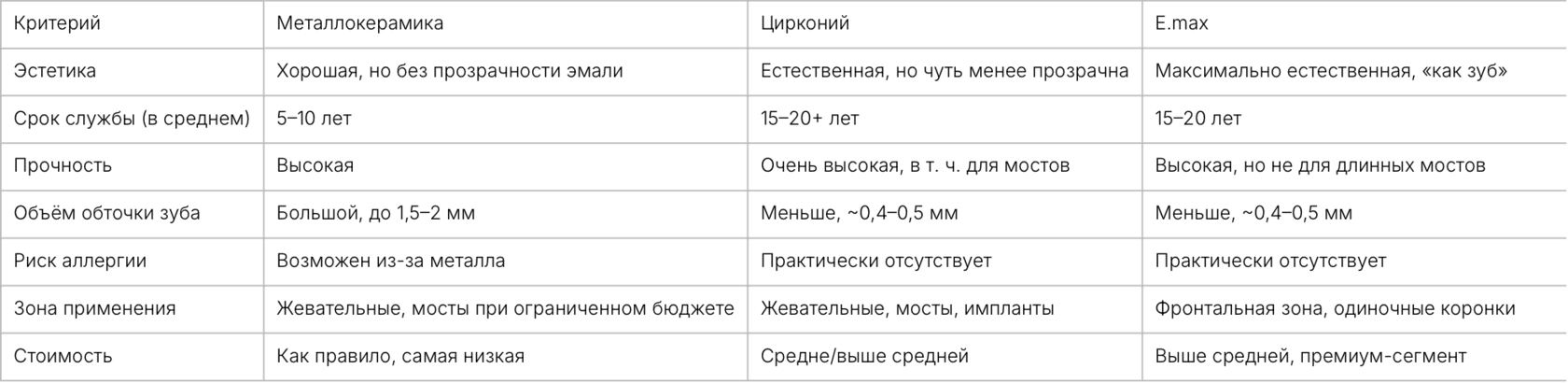 Для пациента важно: все три варианта восстанавливают форму и функцию зуба, разница – в эстетике, сроке службы, объёме обточки и цене.
